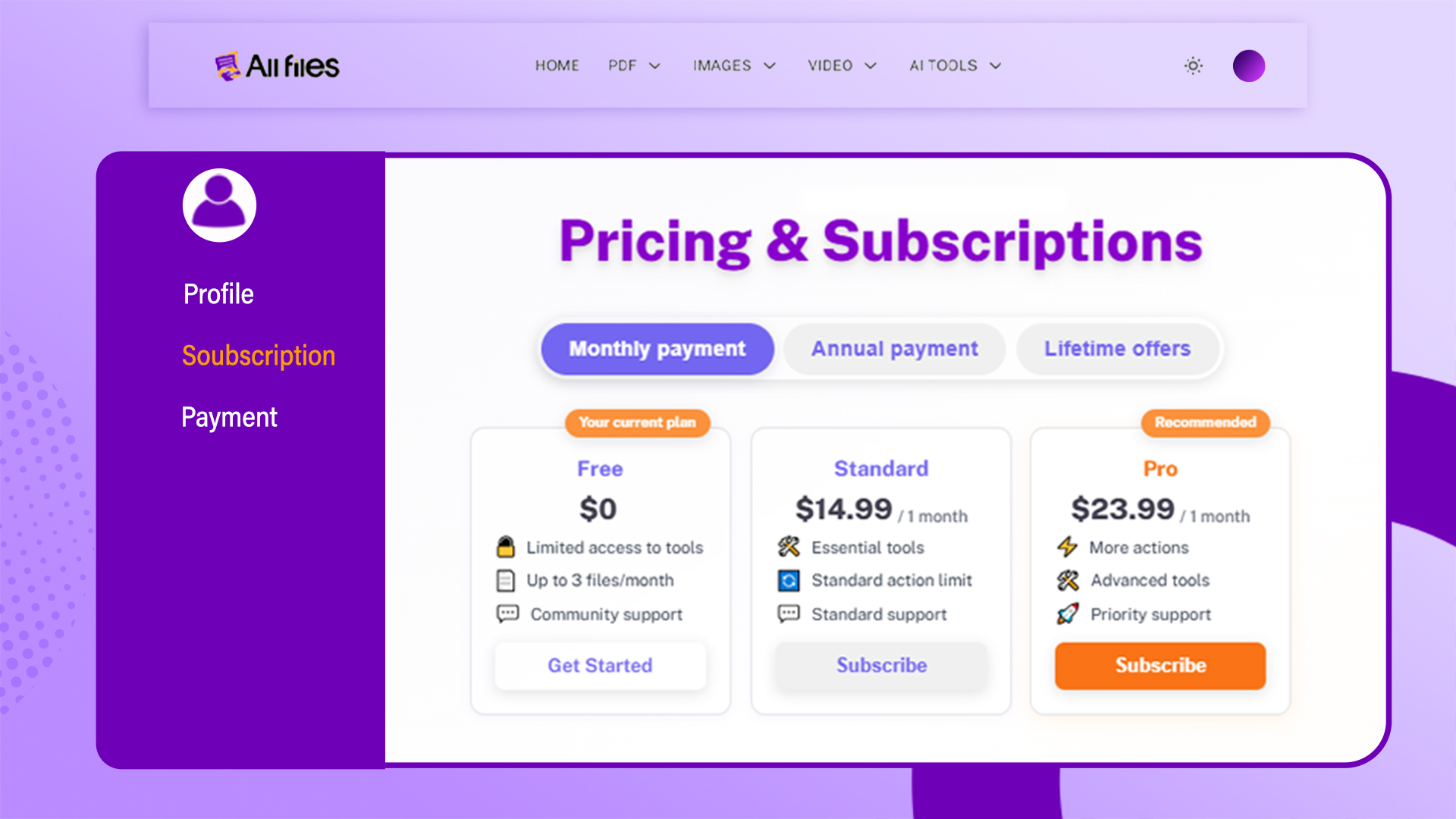 Say goodbye to monthly fees. Get unlimited access to All Files tools forever with our lifetime subscription plans.